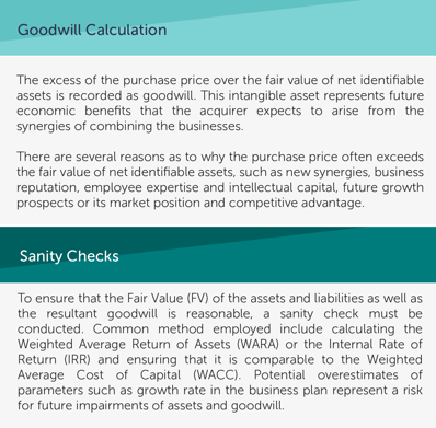 The application of goodwill accounting is an important element. This is the difference between the purchase price and the net value of the assets, minus any liabilities. Due to the subjective nature of intangible assets, this can be more challenging to determine if there are limited market comparables. For this reason, it is advisable to seek out the expertise of professionals with extensive knowledge of fair value methodologies.